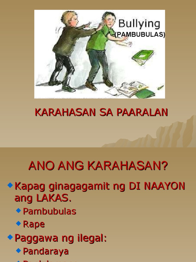 Uncategorized Epekto Ng Pambubulas Ang pambubulas o bullying sa ingles ay isang paraan ng panankit sa pisikal o emosyonal na parte ng isang indibidwal o grupo ng mga tao Sa desisyon ng supreme court tatanggalin na sa required subjects ang filipino panitikan at philippine history